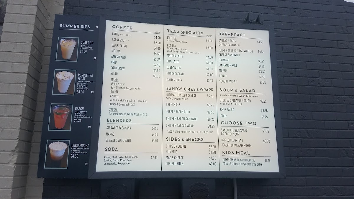 The menu at Stories Coffee Company is thoughtfully crafted to cater to all tastes. From invigorating grab-and-go options, like refreshing apple juice at $1.75 and hearty Core Power Chocolate for energy at $4.25, to a delightful selection of coffee and tea that includes robust Chai Lattes and creamy Matcha Lattes. Each drink is made with high-quality ingredients, sure to tantalize your taste buds.
